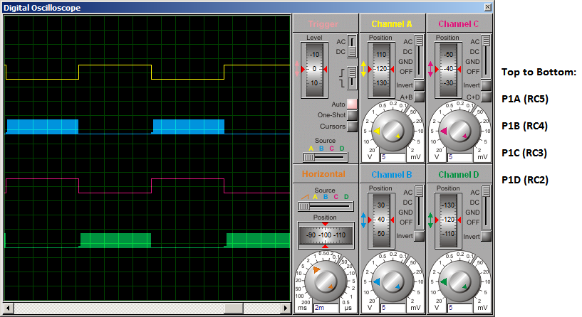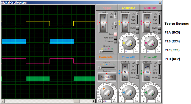 Hi tahmid, I have tested the circuit with PIC16F684 in Proteus with an external crystal 16Mhz (it's correct?), but the output waveform present a discrepancy, see the image below :